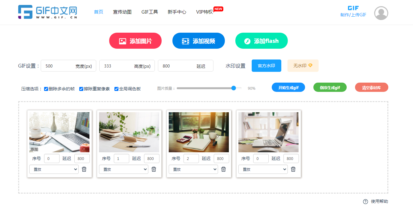 闪图是动图常见的一种展现形式,时尚的闪图显得非常的另类个性,通过将多张图片,个性化排列然后做成一张不停切换的动图。现在这种类型的gif制作(https://www.gif.cn/)的动图使用的范围非常的广泛,比如可以作为表情包,也可以在推文中使用,接下来给大家分享一下如何亲手制作这种类型的闪图特效,感兴趣的小伙伴们一起来看一下。 点击“添加图片”,将准备合成的图片上传到网站中,然后对图片进行排序,在序号框中填入数字即可调整图片排列的顺序。 设置图片生成的参数,宽或者高,设置延迟,勾选压缩选项,gif怎么压缩变小一点,调整图片的质量,图片的质量越高,生成的gif动图越清晰。 设置完成之后,点击开始生成gif,等待一分钟左右即可完成gif闪图特效的制作,点击下载图片。 效果如下图所示。 想要了解更多的gif在线制作的技巧,请关注GIF中文网新手中心(https://www.gif.cn/help),我们将不断完善网站操作技巧及常见问题的整理。