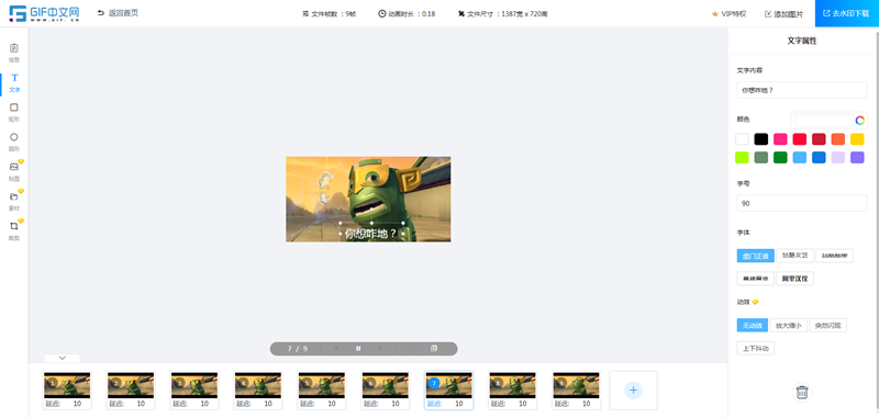 在使用动图的表情包的时候,经常会看到很多的gif动图都是许多电视剧,电影,动画等视频的画面,附上自制的文字制作出来的,非常的好玩。那么如果想要将视频动画转换为gif动画的话,该怎样来操作呢?下面给大家分享一款视频转gif软件(https://www.gif.cn/),只需要准备好视频即可在线将视频转化gif,下面是具体的操作方法。 设置画布尺寸,根据使用需求,可自定义生成gif尺寸,输入宽和高的数值,点击锁定宽高比,防止图片变形,点击开始截图,停止截图,取图完成,确定截取的视频长度,点击确定提交,进入gif编辑器页面。 一般视频都会带有原字幕,使用gif裁剪功能,将原字幕裁掉,然后点击加字按钮,输入文字,选择字体,颜色,特效,大小,完成在线gif加字操作。还支持贴图,素材,图形,裁剪功能。 返回信息页面,默认选择压缩选项,保证生成动图文件较小,如果想要更清楚的gif动图,可以关闭压缩选项,选择图片质量为原图,点击右上角去水印下载。 以上就是将视频动画转换为gif动画的操作方法,大家也可以按照以上的操作步骤将电视剧,电影,短视频等内容转换gif动图。并且还支持图片合成gif动图功能,大家也可以将多张图片合成gif动图,欢迎大家使用gif中文网来制作gif动图。