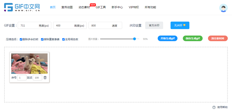 随着现在网络的快速发展,现在很多的图片设计,图片制作的操作都可以在线来完成,无需再去下载软件,有效的节省时间,提升自己的工作效率。接下来小编给大家分享一款做图片的软件,通过几个简单的操作步骤,快速完成视频转gif(https://www.gif.cn/)动图。下面是给大家分享的具体操作方法,有兴趣的小伙伴可以了解一下。 点击“添加视频”按钮,上传需要转换gif图片的视频,点击【开始取图】【停止取图】【取图完成】来获取所需的视频画面。 视频截取完成之后会自动转化为gif格式,下一步可以设置gif图片的参数,比如宽高尺寸,延迟(画面切换的速度),图片质量。默认压缩选项全部开启,可生成更小的gif图片,如要求图片清晰度更高,可以勾掉压缩选项,点击“开始生成gif”或者“倒序生成gif”按钮。 在弹窗中查看预览效果,点击“下载图片”,即可快速完成gif在线制作。 在大家想要将视频做成gif动画效果的时候,可以使用以上小编分享的方法来进行制作,操作简单快捷,小白也能够轻松使用。GIF中文网还支持合成图片,动图在线压缩,gif裁剪等功能,能够轻松应对日常gif处理与编辑,欢迎收藏使用!